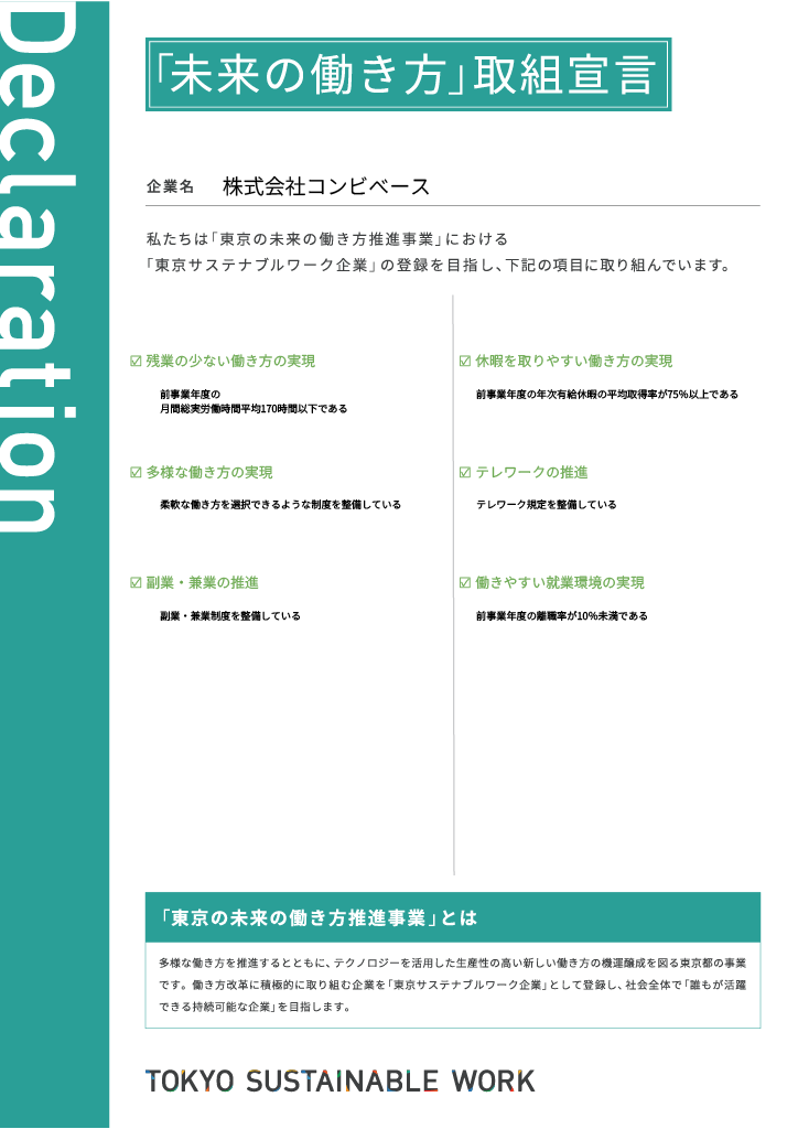 株式会社コンビベースは、この度、東京都が推進する「東京の未来の働き方推進事業」における「東京サステナブルワーク企業」への登録を目指し、働き方改革への積極的な取り組みを宣言しました。