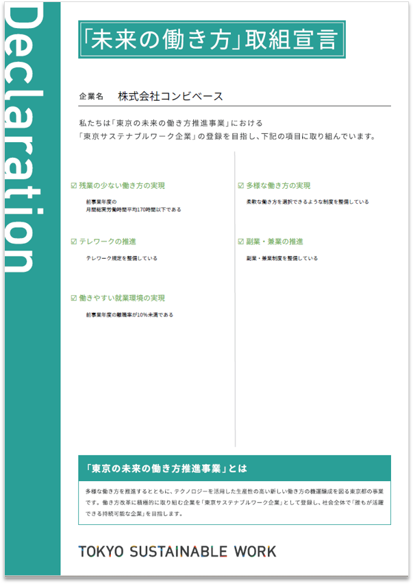 株式会社コンビベースは、この度、東京都が推進する「東京の未来の働き方推進事業」における「東京サステナブルワーク企業」への登録を目指し、働き方改革への積極的な取り組みを宣言しました。